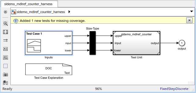 open_system('sldemo_mdlref_counter_harness');Чтобы создать тестовые примеры для отсутствующего покрытия, на вкладке Design Verifier щелкните Добавить отсутствующее покрытие. Уведомление указывает количество добавленных новых тестов.
