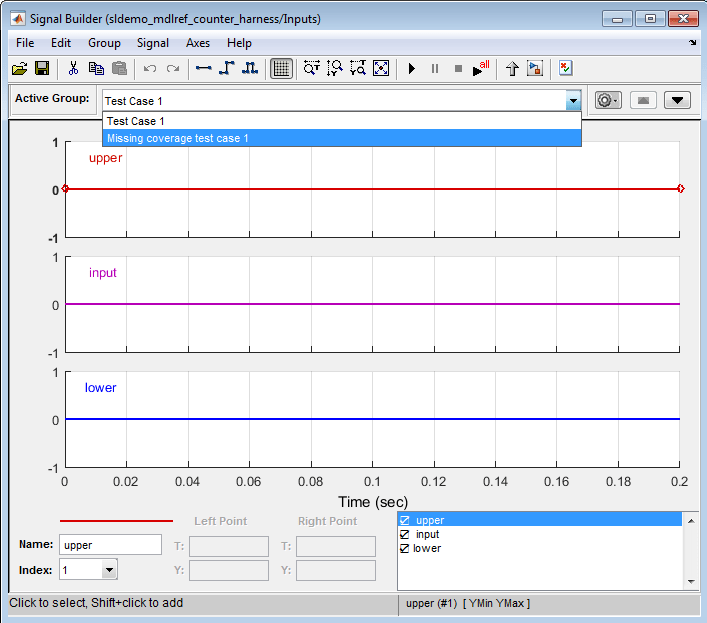 Чтобы достичь недостающего покрытия для ссылочной модели, sldemo_mdlref_counterсмоделировать модель, используя тестовый пример из анализа Simulink Design Verifier.