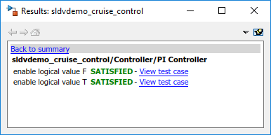 Например, в sldvdemo_cruise_control модель, зеленый контур показывает, что подсистема контроллера PI выполнила все задачи тестирования. Инспектор результатов перечисляет две удовлетворенные цели тестирования для подсистемы контроллера PI.