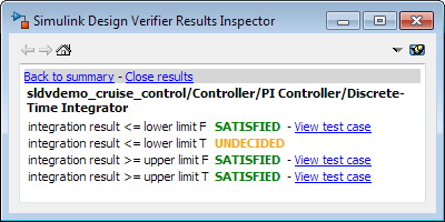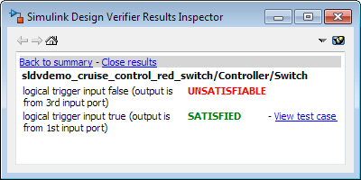 При подсвечивании результатов анализа на модели открывается инспектор результатов Simulink Design Verifier. При щелчке по объекту в модели, имеющему результаты анализа, Инспектор результатов (Results Inspector) отображает сводку результатов для этого объекта.