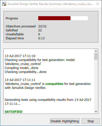 Откройте окно sldvdemo_cruise_control модель и повторно запустите анализ с помощью LongTestcases оптимизация: