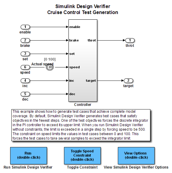 В следующих разделах описывается пример модели Cruise Control Test Generation. В этом примере показано, как использовать Simulink ® Design Verifier™ для создания тестовых примеров, обеспечивающих полный охват модели. В этом примере показано, как анализировать модели с помощью Simulink Design Verifier и интерпретировать результаты.