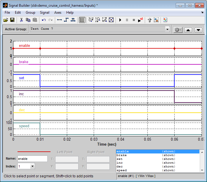 Блок входов - это блок построителя сигналов, который содержит сгенерированные сигналы тестового случая. Дважды щелкните блок входов, чтобы открыть диалоговое окно Signal Builder и просмотреть восемь сигналов тестового примера.