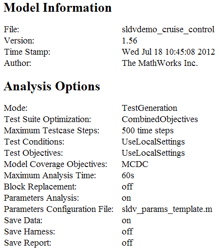 sldvdemo_cruise_control/sldvdemo_cruise_control_report.htmlОтчет HTML содержит следующие главы.