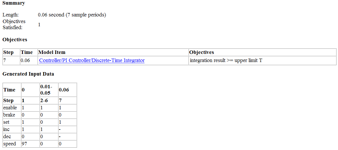 В этом примере тестовый случай 7 удовлетворяет одной цели, чтобы результат интегрирования был больше или равен верхнему пределу. T в блоке интегратора дискретного времени. В таблице перечислены значения шести сигналов от времени 0 до времени 0.06.