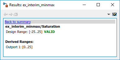 Окно Simulink Design Verifier Results показывает, что выходные данные блока насыщенности никогда не превышали проектный диапазон [-25.. 25]. Входной сигнал блока Насыщения никогда не превышал [0.. 25], который является производным диапазоном, который анализ распространил из блока усиления.
