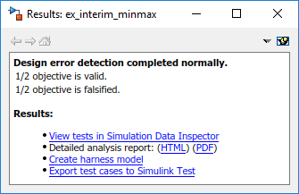 Можно также создать HTML-отчет, содержащий подробную информацию об аналитическом отчете для ex_interim_minmax модель. Чтобы создать этот отчет, в окне Результатов Свидетельства Дизайна Simulink, нажимают отчет о подробном анализе Generate. Отчет об анализе открывается в браузере.