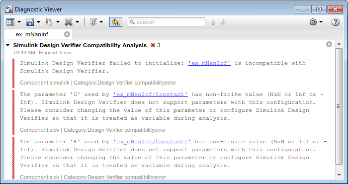Если модель несовместима с Simulink Design Verifier, можно определить и исправить несовместимость с помощью сообщений программы Diagnostic Viewer. Дополнительные сведения см. в разделе Просмотр диагностики.