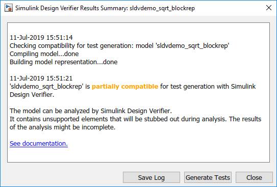 Модель частично совместима, если по крайней мере один объект модели несовместим. Simulink Design Verifier продолжает анализ частично совместимой модели, блокируя неподдерживаемые элементы. По умолчанию для параметра «Автоматическое блокирование неподдерживаемых блоков и функций» установлено значение On. Дополнительные сведения см. в разделе Обработка несовместимости с автоматической остановкой.
