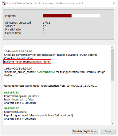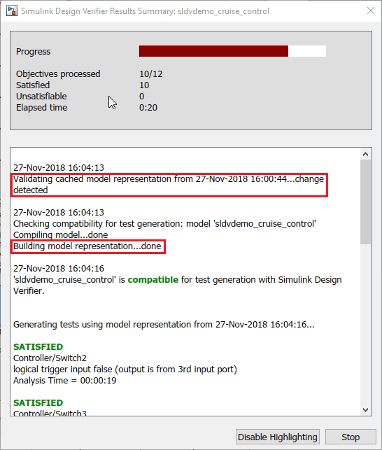Можно настроить опцию для построения или повторного использования представления модели на панели «Проверка конструкции» (Design Verifier), опцию «Перестроить представление модели» (Rebuild model representation) или с помощью команды sldvoptions. По умолчанию для параметра установлено значение If change is detected и программа повторно использует представление модели для анализа, если в модели нет изменений.