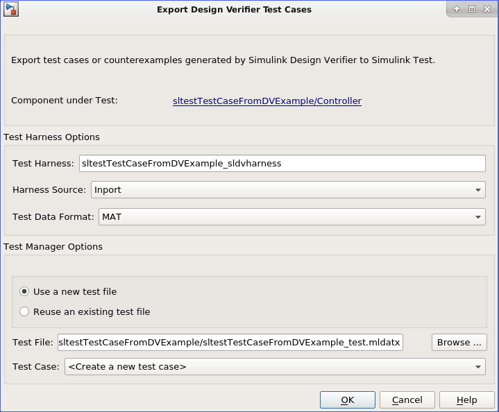 В окне сводки результатов щелкните Экспорт тестовых примеров в Simulink Test. Откроется диалоговое окно Экспорт тестовых примеров Design Verifier.