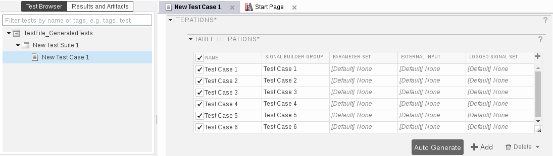 Simulink Test генерирует тестовый файл и тестовый жгут. В диспетчере тестов разверните новый тестовый файл в обозревателе тестов для просмотра отдельных тестовых примеров.