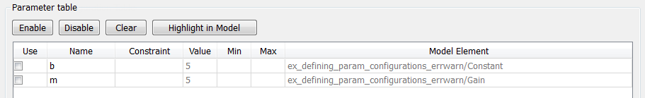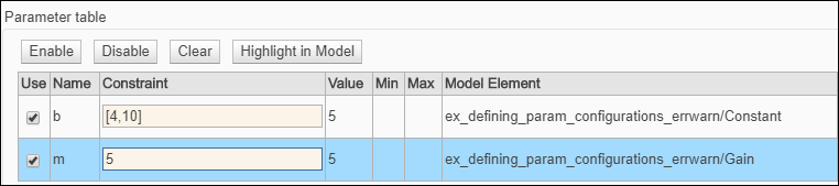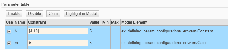 С помощью таблицы параметров можно находить и автоматически генерировать ограничения для параметров в модели. В этом примере используется следующая модель, которая содержит параметры усиления и константы, определенные как m и bсоответственно.