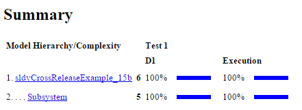 Программное обеспечение моделирует все тестовые случаи и генерирует отчет о покрытии. В отчете указывается, что 100% покрытие достигается для sldvCrossReleaseExample_15b модель.