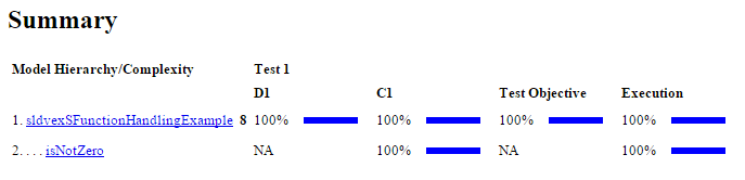 В окне Simulink Design Verifier Results Summary щелкните Simulate tests и создайте отчет об охвате модели. В отчете указывается, что 100% покрытие достигается для sldvexSFunctionHandlingExample модель.