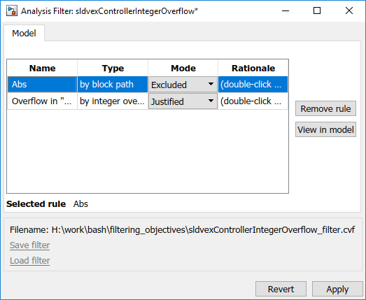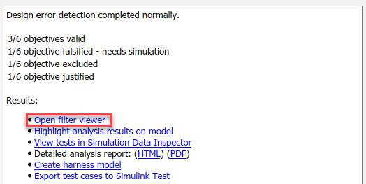 После анализа модели можно использовать средство просмотра фильтров анализа для обоснования сфальсифицированных целей и обновления файла фильтра покрытия.
