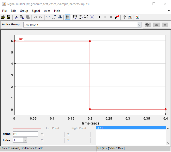 Блок построителя сигналов с именем «Входы» содержит тестовые примеры. Дважды щелкните блок «Inputs» для просмотра тестовых примеров. Из блока Signal Builder можно смоделировать модель с помощью тестовых примеров и создать отчет о покрытии модели, как описано в разделе Моделирование тестов и создание отчета о покрытии модели.