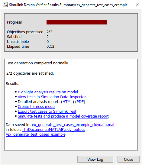Программа Simulink Design Verifier отображает окно журнала и начинает анализ модели для создания тестовых примеров. По завершении анализа в окне Сводка результатов (Results Summary) отображаются опции для просмотра результатов.