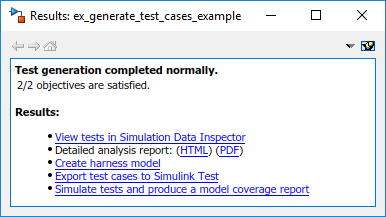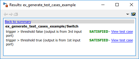 Эта таблица показывает, что анализ удовлетворил обе цели теста, связанные с блоком Switch в ex_generate_test_cases_example модель, для которой она сгенерировала два тестовых случая.
