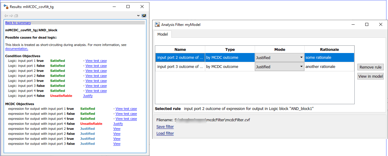 Неудовлетворительные или неопределившиеся цели MCDC включают ссылку «Обоснование». Щелкните эту ссылку, чтобы создать соответствующее правило фильтрации. Поскольку каждая цель MCDC в Simulink Coverage соответствует двум целям MCDC в Simulink Design Verifier, цели MCDC Simulink Design Verifier обосновываются парами.