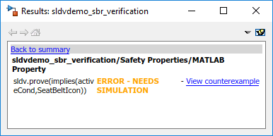 sldvdemo_sbr_verification модель содержит фальсифицированное свойство, поскольку ограничение отключено. В sldvdemo_sbl_verification_fixed модель, ограничение включено, и все свойства доказаны.