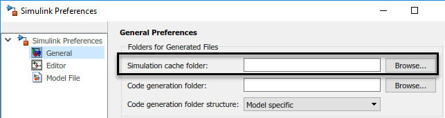 Файл кэша Simulink хранится в расположении, указанном в диалоговом окне Настройки Simulink > Общие в папке кэша Simulation. По умолчанию файл кэша Simulink хранится в текущей рабочей папке.