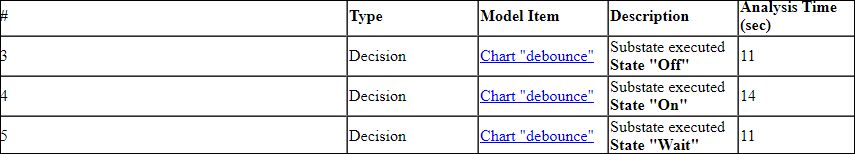 В таблице показана одна из целей испытаний для конструкторской модели в sldvdemo_debounce_testobjblks пример модели.