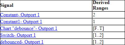 Таблица в подразделе «Модель конструкции» показывает список каждого производного диапазона в sldvdemo_debounce_validprop пример модели.