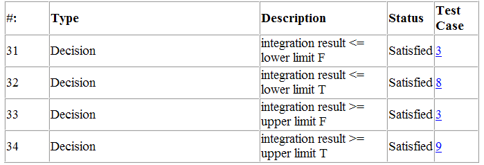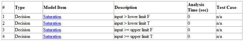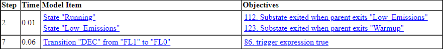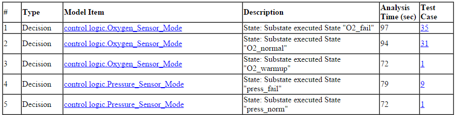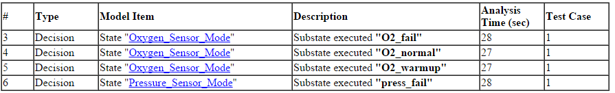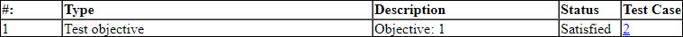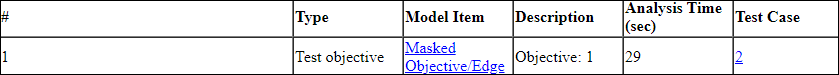 В главе «Элементы модели» отчета содержится таблица для каждого объекта модели, определяющая цели покрытия. В таблице для конкретного объекта перечислены все связанные цели, типы целей, описания целей и статус каждой цели в конце анализа.