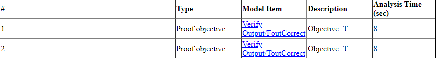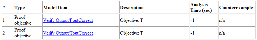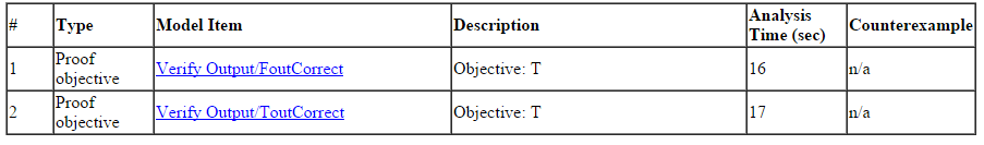 На этом рисунке показан раздел «Действительные цели» созданного отчета об анализе для sldvdemo_debounce_validprop пример модели.