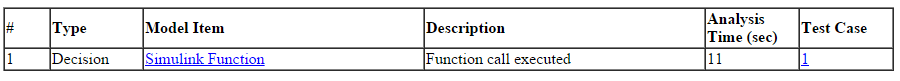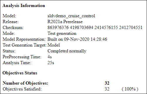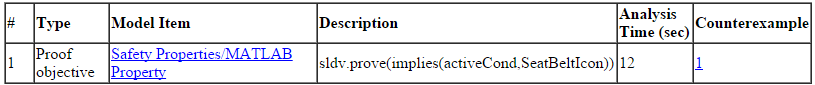 На этом рисунке показана часть раздела «Цели, удовлетворенные» созданного отчета об анализе для sldvdemo_fuelsys_logic_simple пример модели.