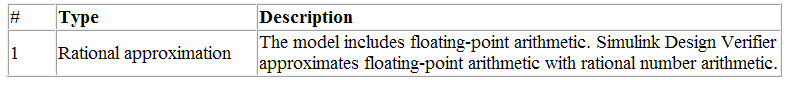 Каждая строка таблицы Аппроксимации описывает конкретный тип аппроксимации, который Simulink Design Verifier использовал при анализе модели.