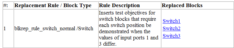 Каждая строка таблицы соответствует определенному правилу замены блоков, которое Simulink Design Verifier применил к модели. В таблице перечислены следующие элементы: