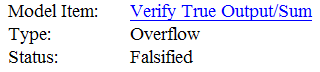 В следующем примере программное обеспечение проанализировало sldvdemo_debounce_falseprop модель для обнаружения ошибок конструкции. Анализ обнаружил ошибку переполнения в блоке Sum в подсистеме проверки с именем Verify True Output.