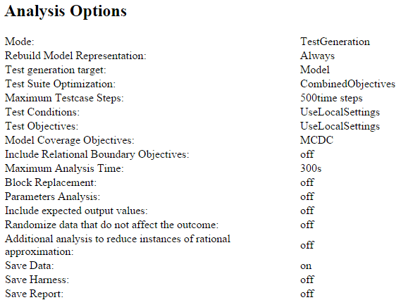 В разделе Опции анализа (Analysis Options) перечислены параметры, повлиявшие на анализ Simulink Design Verifier. Если включена фильтрация покрытия, имя файла фильтра будет включено в этот раздел.