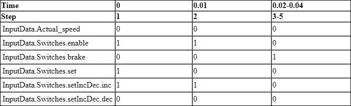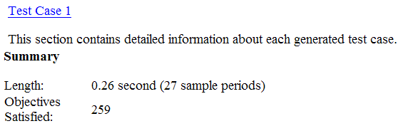 Для каждого входного сигнала, связанного с элементом модели, в разделе Сгенерированные входные данные (Generated Input Data) перечислены временной шаг и соответствующее время, в которое тестовый случай достигает конкретных целей теста. Если значение сигнала не изменяется в течение этих временных шагов, в таблице в качестве диапазонов указаны временной шаг и время.