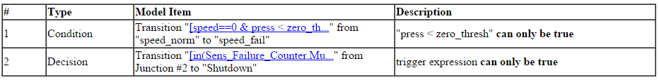 На этом рисунке показан раздел Dead Logic созданного отчета об анализе для sldvdemo_fuelsys_logic_simple модель.