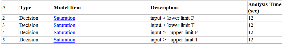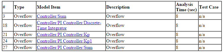 Раздел «Неподдерживаемые блоки» (Unsupported Blocks) появляется только в том случае, если анализ блокирует неподдерживаемые блоки; в нем перечислены неподдерживаемые блоки в таблице с гиперссылкой на каждый блок в модели.