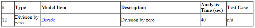 Для всех типов целей в разделе Цели, не определенные из-за деления на ноль перечислены неопределившиеся цели во время анализа из-за ошибок разделения на ноль в связанных элементах модели. Чтобы обнаружить ошибки деления на ноль перед выполнением дальнейшего анализа модели, выполните процедуру, описанную в разделе Обнаружение переполнения целых чисел и Ошибки деления на ноль.