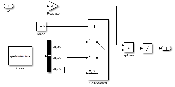 Предварительная загрузка значения переменной рабочей области MATLAB kpGainsStructure. Структура содержит поля. Kp1, Kp2, и Kp3.