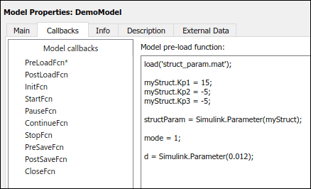 Щелкните PreLoadFcn, затем загрузите Kp1, Kp2 и Kp3 поля myStruct: