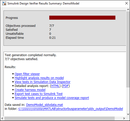 Когда программное обеспечение закончит свой анализ, в окне Резюме Результатов Свидетельства Дизайна Simulink, рядом с отчетом о Подробном анализе, выберите HTML.