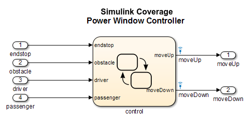 Блок модели с именем control в power_window_control_system подсистема ссылается на компонент, проверенный в этом примере, slvnvdemo_powerwindow_controller.