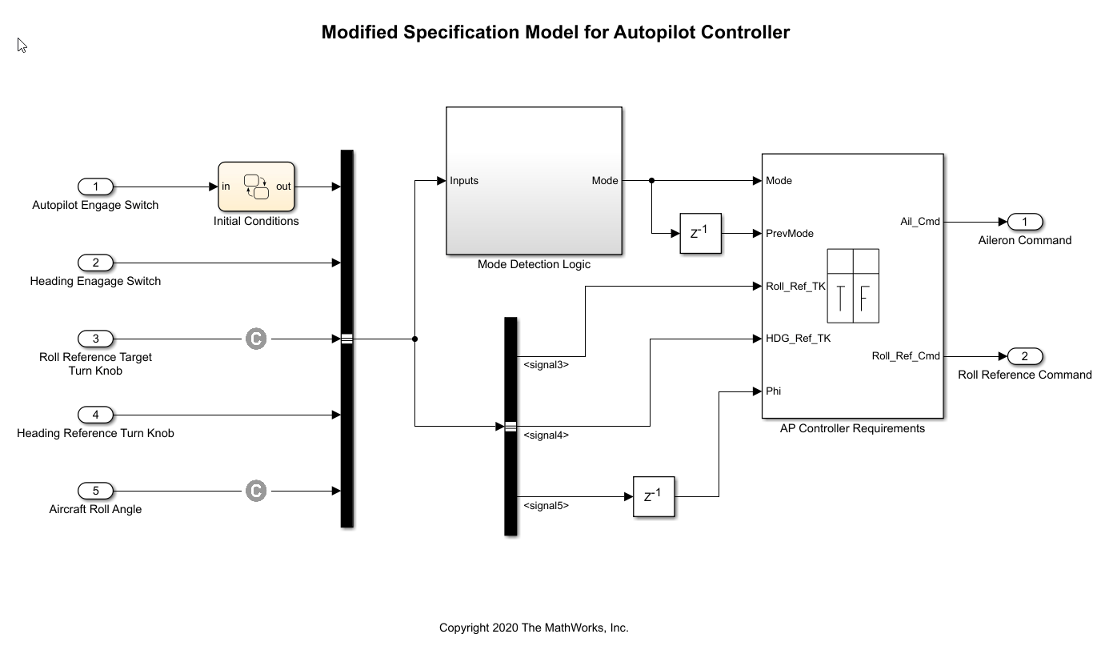 Рассмотрим модель контроллера автопилота, описанную в разделе Использование модели спецификации для тестирования на основе требований. Для этой демонстрации требования состоят из логических и временных условий разомкнутого цикла.