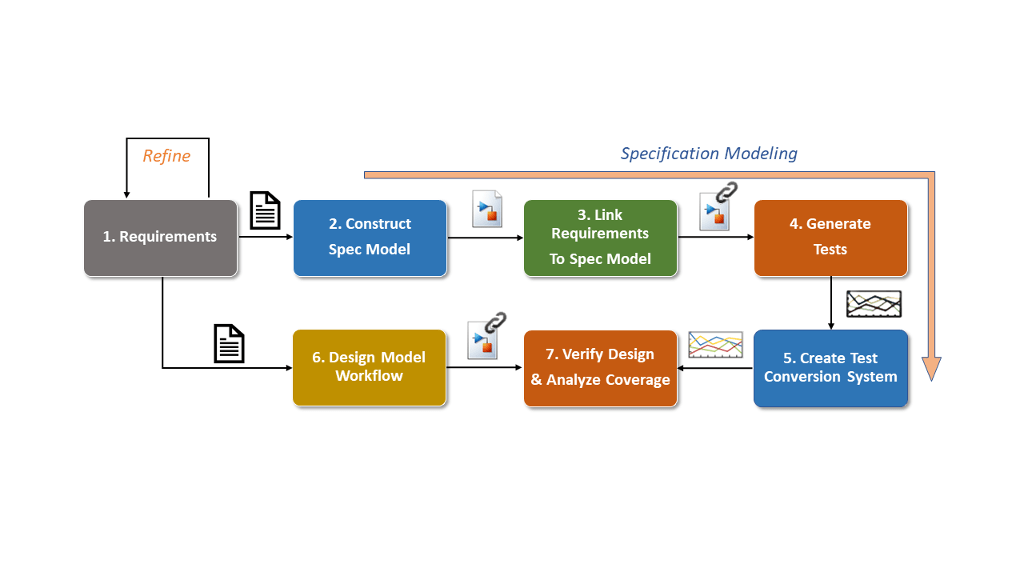 Если имеется набор требований, написанных на естественном языке, их можно преобразовать в формальные (исполняемые) спецификации с помощью Simulink. Затем они становятся моделью спецификации. В отличие от конструкторской модели, модель спецификации определяет только то, что должно быть сделано, а не то, как это должно быть сделано. Он фиксирует требования на более высоком уровне и скрывает детали на более низком уровне.