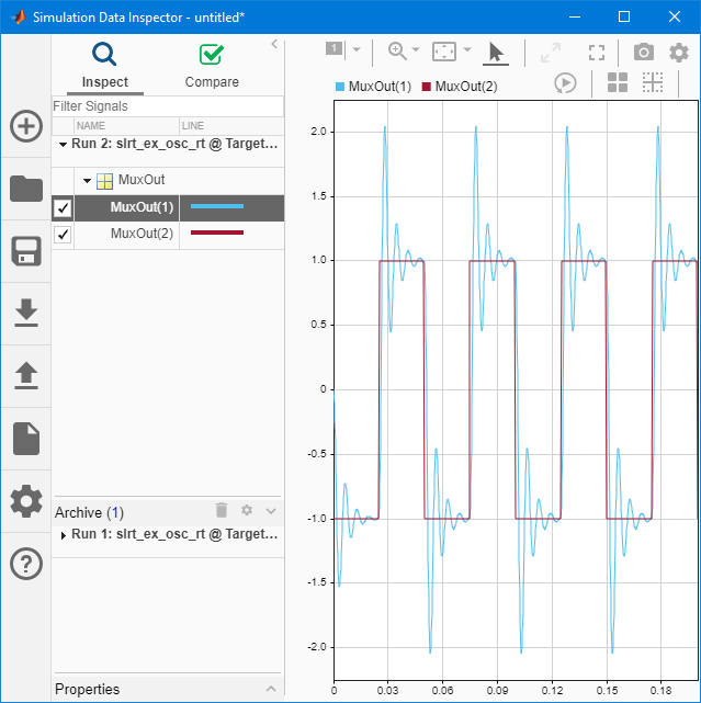 Необходимо выполнить шаги в разделе Подготовка приложения в режиме реального времени с использованием языка MATLAB. В модели выберите выходной сигнал и отметьте сигнал для регистрации с помощью инспектора данных моделирования.