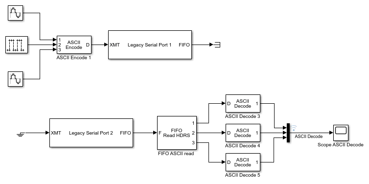 Перетащите блок декодирования ASCII в модель Simulink. Этот блок декодирует выходные данные из порта RCV блока устаревших последовательных портов.