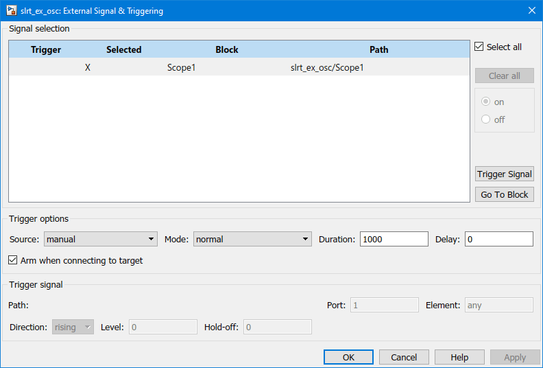 В этой процедуре используется модель slrt_ex_osc. Эта модель содержит блок области Simulink. Чтобы настроить запуск для моделирования внешнего режима: