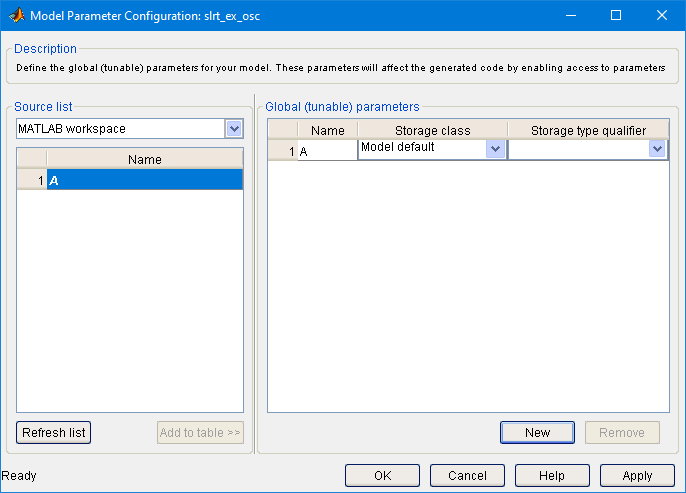 Щелкните Настроить. Откроется диалоговое окно Конфигурация параметра модели (Model Parameter Configuration). Рабочая область MATLAB содержит константу, назначенную A.