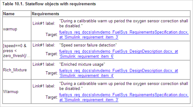 Список требований, связанных с моделью или объектом модели. В этом примере щелкните имя целевого документа, чтобы открыть документ требований, связанный с slvnvdemo_fuelsys_officereq модель.